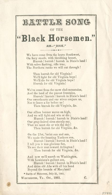 We have come from the brave Southwest (5 vs. and chor.) Air—"Dixie." [Signed] C, Winchester, Va. Oct., 1861; with footnote at bottom. Double-line border. 21.5 x 13 cm.