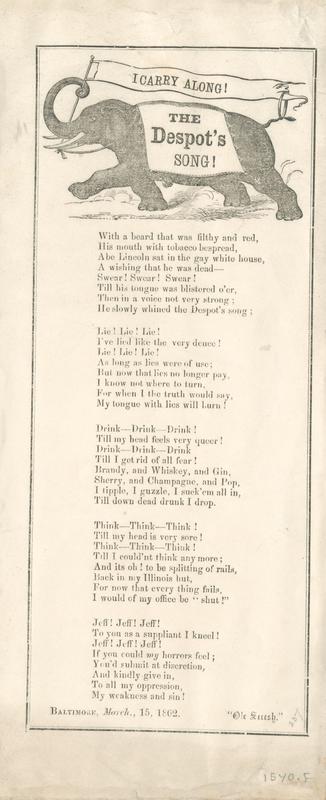 With a beard that was filthy and red (5 vs.) [Signed] "Ole Secesh." [Francis O. Ticknor]; Balti- more, March, 15, 1862. Double-line border; elephant with slogan "I Carry Along!" 26.7 x n.2 cm.