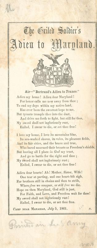 Adieu my home! Adieu dear Maryland (3 vs.) Air— Bertrand's Adieu to France. Camp near Manassas, July 5, 1861; [signed] X; with MS. note "Printed in Lee's Army". Double-line border; arms of Maryland. 24.5 x 10 cm.