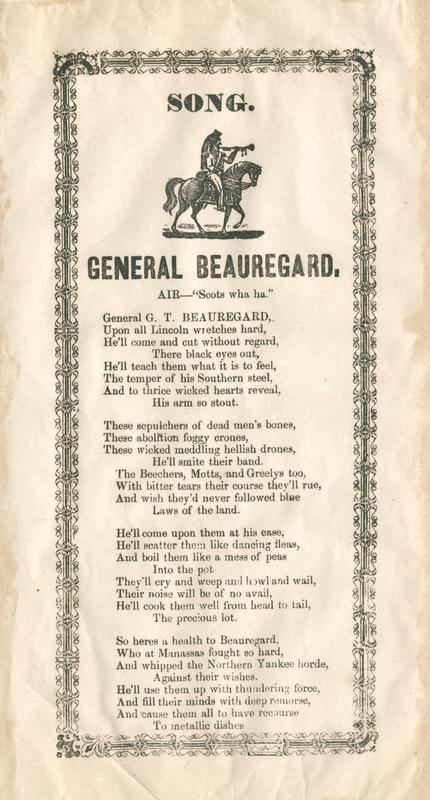 General G.T. Beau- regard (4 vs.) Air—"Scots wha ha." Headed: "Song." T. o. border; cavalryman with trumpet. 15.9 x 30.1 cm.