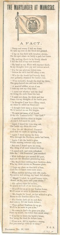Dusty and weary I laid me down (33 two-line vs.) Baltimore, Dec. 16, 1861; [signed] N.G.R[idgeley]. Double-line border; [Bonsai] flag of Maryland. 35 x 8.8 cm.