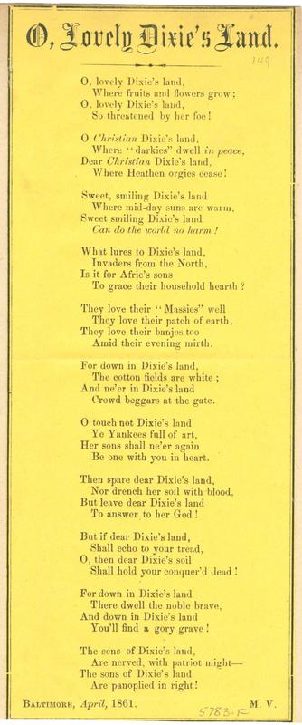 O, lovely Dixie's land (11 vs.) Baltimore, April, 1861; [signed] M.V. |