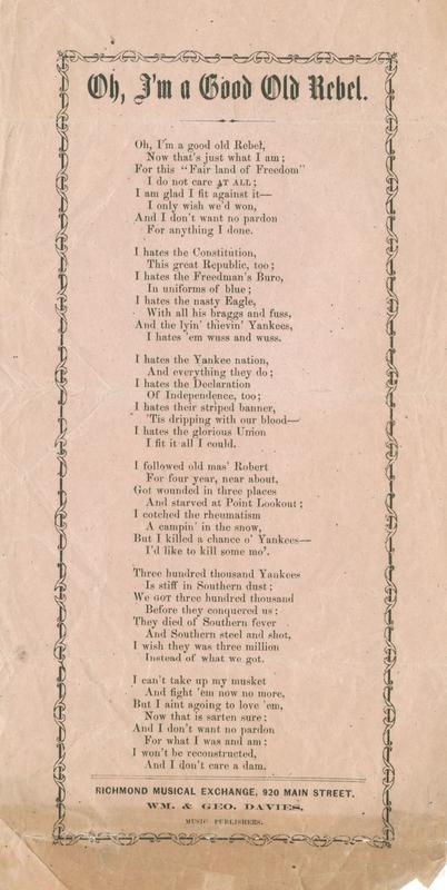 Oh, I'm a good old Rebel (6 vs.) Publ. Wm. and Geo. Davies. T. o. border; pink paper. 28.8 x 14.1 cm.