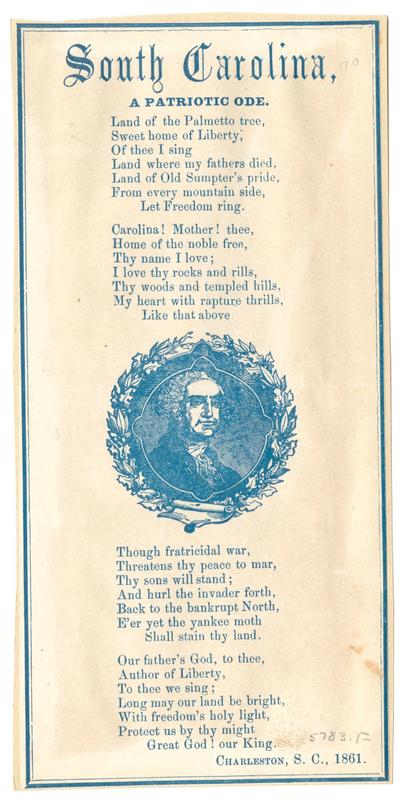 Land of the Palmetto tree (4 vs.) Charleston, S. C, 1861. Blue ink; double-line border; bust of Washington. 18.2 x 8.8 cm.