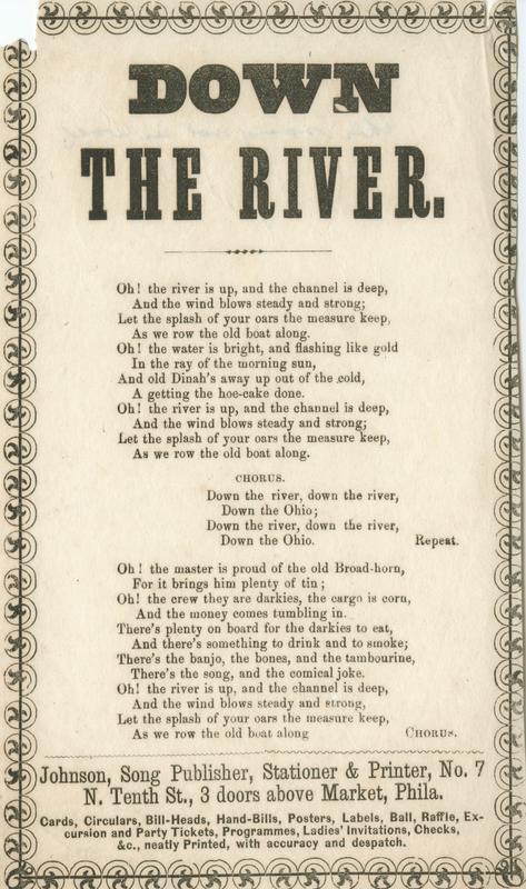 Oh! the river is up, and the channel is deep (2 vs. and chor.) Publ. Johnson (2); adv: Cards, Circulars, Bill-Heads, etc. T.o. border. 20.5 x 12.2 cm.