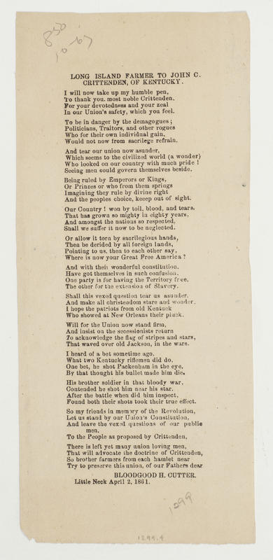 I will now take up my humble pen (13 vs.) Signed: Bloodgood H. Cutter. Little Neck, April 2, 1861. 22.6 x 9.9 cm.