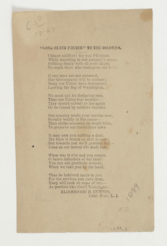 Citizen soldiers! for you I'll write (7 vs.) Signed: Bloodgood H. Cutter, Little Neck, L.I. 15.5 x 9.8 cm.