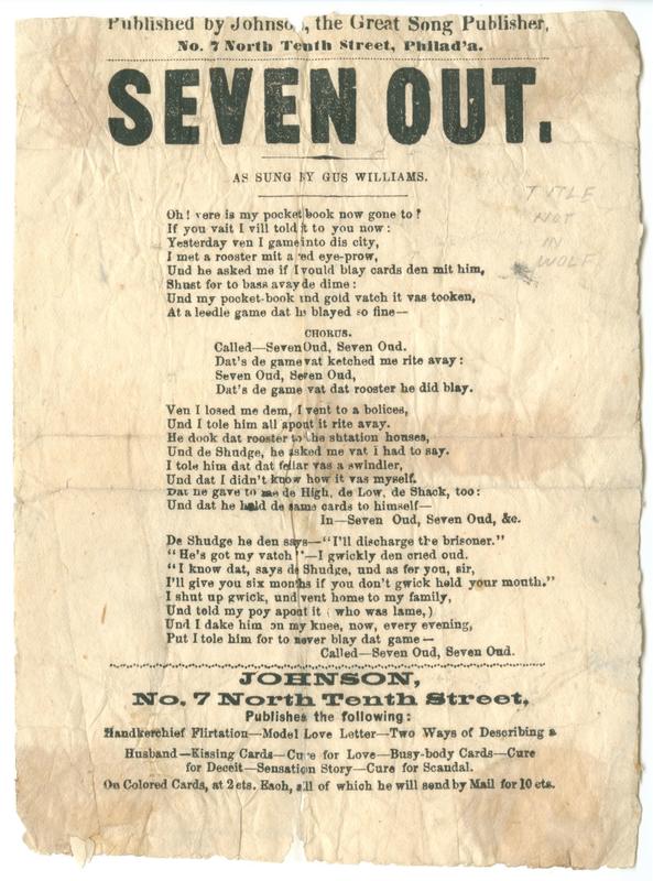 Oh! vere is my pocketbook now gone to? (3 vs. and chor.) Publ. Johnson (2); As sung by Gus Williams; adv: Handkerchief Flirtation - Model Love Letter ... On Colored Cards. 17.2 x 12.6 cm.