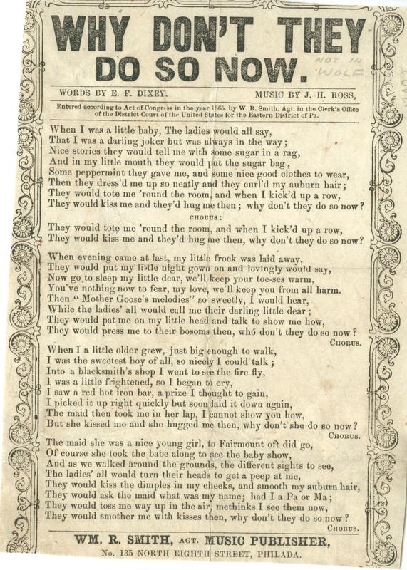When I was a little baby, The ladies Would all say (4 vs. and chor.) Words by E.F. Dixey; Music by J.H. Ross; cop: 1865, W.R. Smith, EDPa; publ. Smith. A-J border. 18 x 12.8 cm. (cropped)