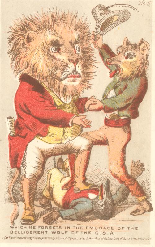 comic cards satirizing the diplomatic relations between the United States, Confederate States, Great Britain, France, and
