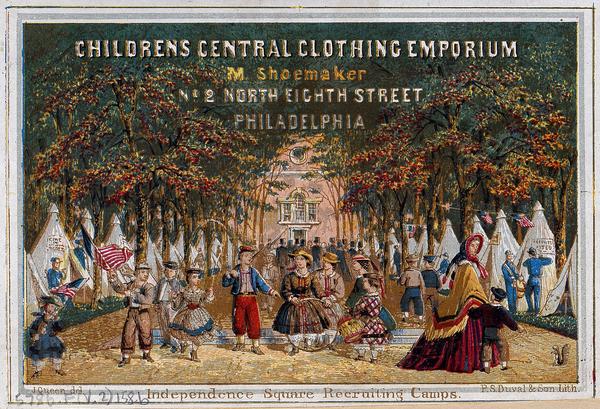 Tradecard depicting well-dressed children on the central promenade of Independence Square when used as Camp Independence, Civil War recruitment camp, in September and October 1862. Tents manned by soldiers line the promenade and the children who carry drums, flags, and a hoop, walk between a group of men and a mother and son. Mary Shoemaker operated from 2 North Eighth Street circa 1862-circa 1864.