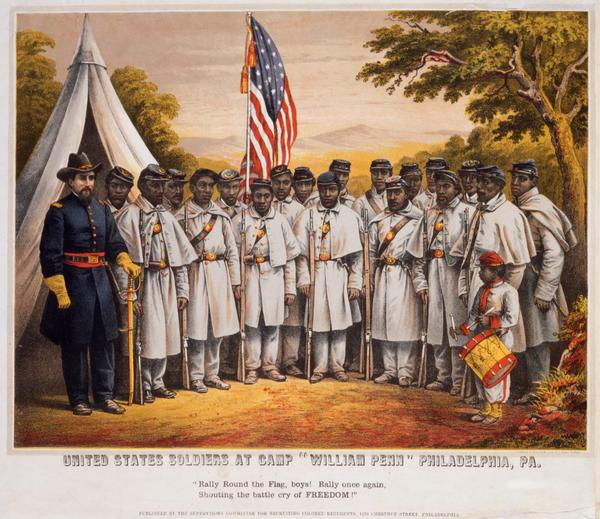 Recruitment print depicting members of an African American regiment posed with their white commander at Camp William Penn, Cheltenham Township. The troop members, including the drummer boy, wear their military best and are gathered on an open green near a tent. One soldier proudly displays the American flag. Begun in 1863 with the support of the Union League, eleven regiments were formed at Camp William Penn, the first Pennsylvania camp for volunteer African American regiments. William Penn was the largest Civil War camp for the training of officers to lead African American troops.