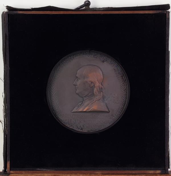 Inscription on the front reads, “Benjamin Franklin Printer Philosopher Scientist Statesman Diplomat.” The back reads, “Struck by an Act of Congress of the United States History Literature Science Philosophy To Commemorate Two Hundredth Anniversary of the Birth of Benjamin Franklin MCMVI.” A profile of Franklin’s head appears on the medal with the dates, “1706-1790.”