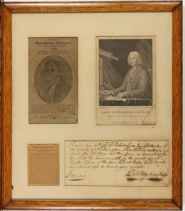 Frame contains: 1. Page of Rittenhouse Almanac, 1820; 2. Engraving of David Rittenhouse; 3. Newspaper clipping, "Rittenhouse's First Clock"; 4. Receipt signed by David Rittenhouse.