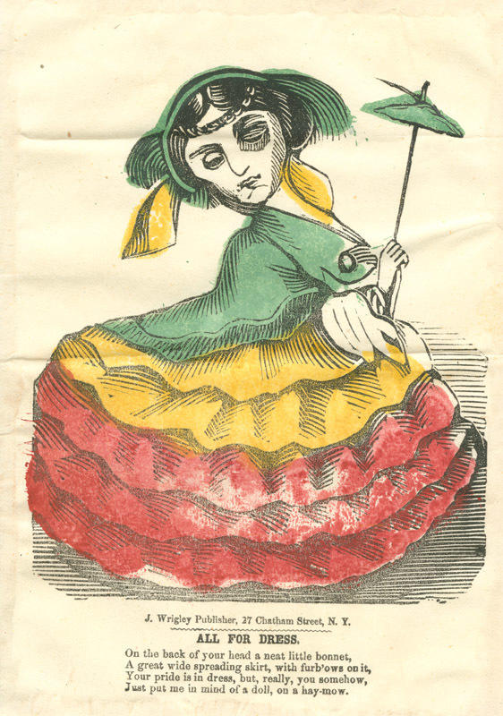Text: On the back of your head a neat little bonnet, / A great wide spreading skirt, with furb'ows on it, / Your pride is