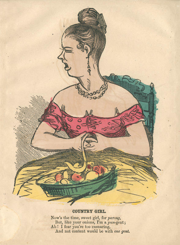 Text: Now's the time, sweet girl, for paring, / But, like your onions, I'm a pun-gent; / Ah! I fear you're too ensnaring,