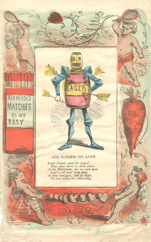 The man's torso is a barrel of lager that shields him from cupid's arrows. His limbs are covered with armor, and his face