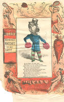 The valentine depicts a man with a dog's head. He wears boxing gloves labeled "insant death" and "six months illness.". He also wears a monocle and a top hat, which suggest that he is a "puppy," or dandy. The border features matches, a heart-shaped beet, and cherubs playing tennis and tug o' war. The label on the matchbox reads "Red-headed matches go off easy," and the beet is marked "D.B." [i.e. "dead beat" or "dead beet"].