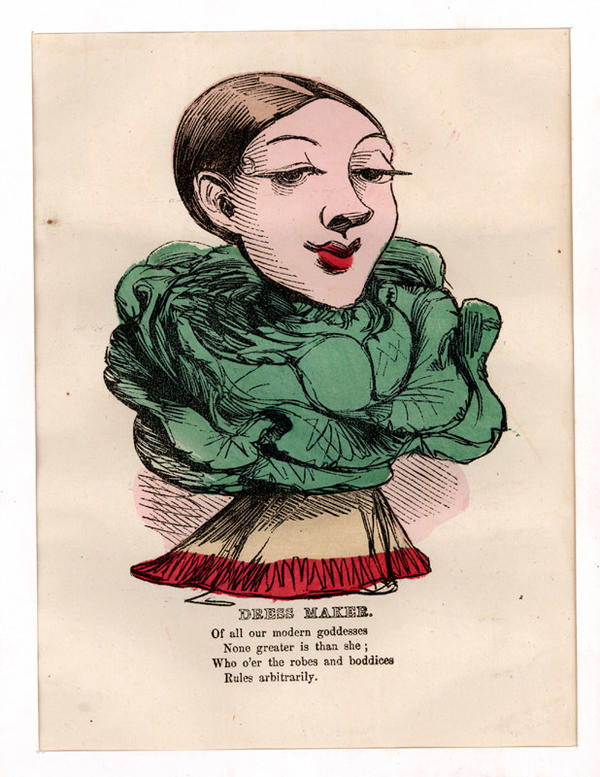 The valentine shows a female figure whose neck and torso are a cabbage. Cabbage refers to the material leftover from making a garment. The valentine suggests that dressmakers steal it to make their own clothing.
