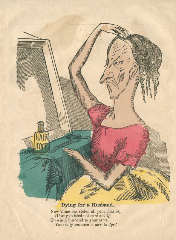 The valentine depicts a wrinkled woman sitting in front of a mirror. In front of her is a bottled labeled "hair dye." The valentine mocks older single women who dye their hair and portrays them as desperate for matrimony.