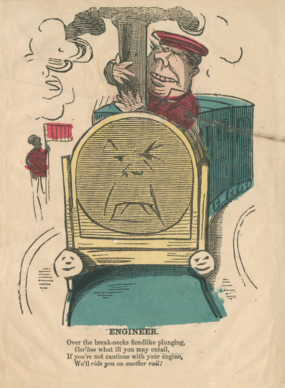 Text: Over the break-necks fiendlike plunging, / Car'less what ill you may entail, / If you are not cautious with your engine, / We'll ride you on ANOTHER RAIL!