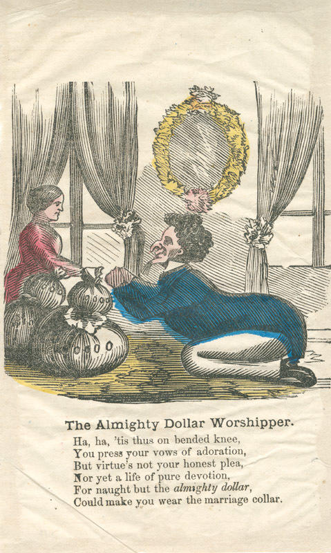 Text: Ha, ha, 'tis thus on bended knee, / You press your vows of adoration,/ But virtue's not your honest plea,/ Nor yet a life of pure devotion,/ For naught but the almighty dollar,/ Could make you wear the marriage collar.
