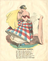 A woman wears a plaid gown with a low neckline that reveals her breasts. Her crinoline billows up, revealing her petticoat.