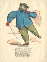 A man on ice skates has long mutton chops and holds a walking stick, suggesting that he is a dandy. The valentine encourages
