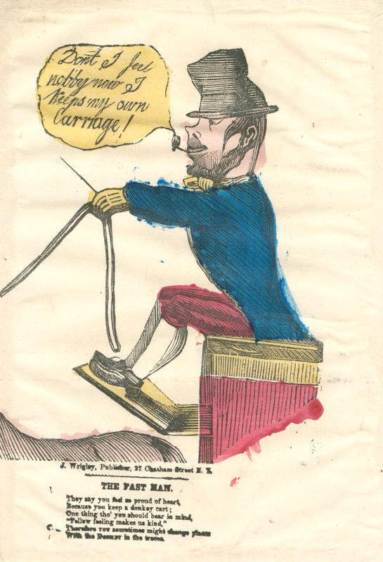 A man driving a carriage and says, " Don't I feel nobby now I keeps my own carriage?" "Nobby" is slang for smart or elegant. |