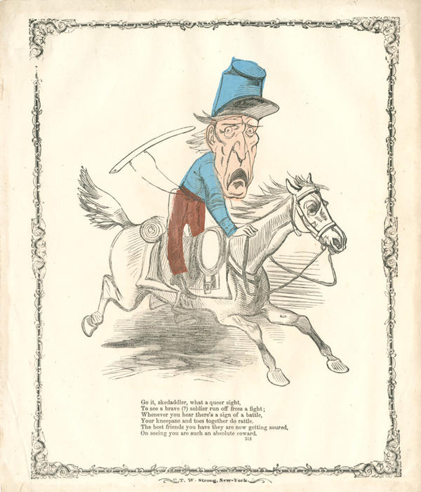 Text: Go it, skedaddler, what a queer sight, / To see a brave (?) soldier run off from a fight; / Whenever you hear there's a sign of a battle, / Your kneepans and toes together do rattle. / The best friends you have they are now getting soured, / On seeing you are such an absolute coward.