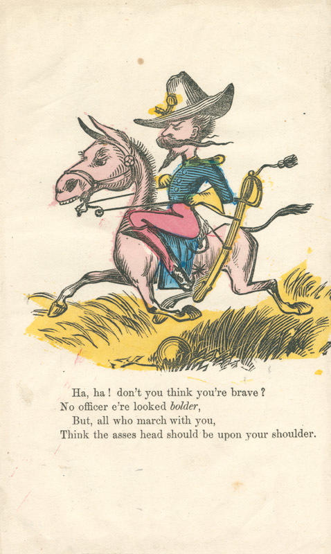 Text: Ha, ha! don't you think you're brave? / No officer e'er looked bolder / But, all who march with you, / Think the asses head should be upon your shoulder.