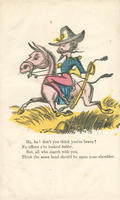 A Union calvalryman rides a donkey. He has a sword and spurs. The valentine suggests that his appearance does not match his abilities.