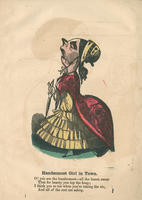 A woman wears a dress with furbelows and a bustle. The valentine suggests that she is not a beauty, but attracts male attention when she is the only woman out at night. Bustles became popular after 1869.