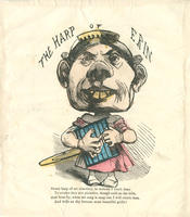 An Irish woman wears a cap and has bucked yellow teeth. She holds a toaster rack as if it were a harp. Above her is written