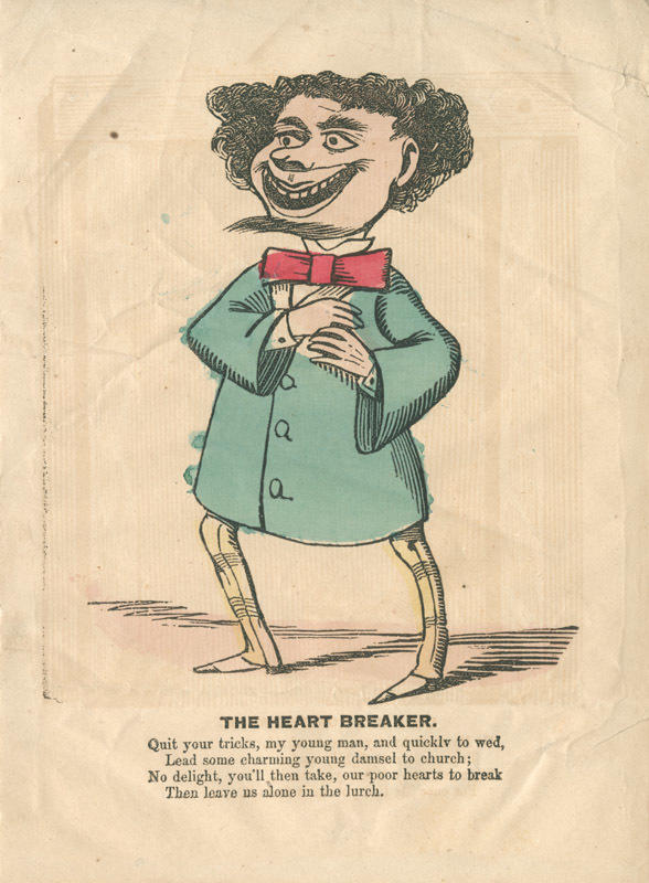 A man holds his hands to his heart. He wears a frock coat, bow-tie, and thin trousers. His hair is curled. |