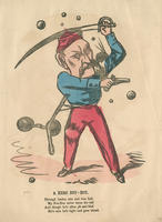 A Zouave Union soldier holds a pistol and a sword. Cannon balls fly in the background, suggesting that he is in danger, and foolisth rather than brave.