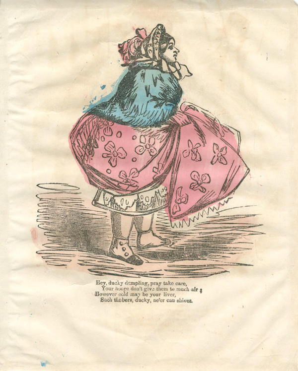 Text: Hey, ducky dumpling, pray take care, / Your hoops don't give them to much air; / However, cold may be your liver, / Such timbers, ducky, ne'er can shiver.