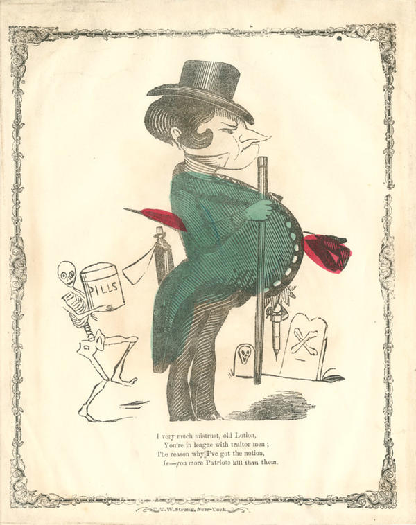 The doctor holds a cane in one hand and an umbrella under his other arm. Dangling from his waist is a syringe and a bottle sticks out of his back pocket. He stands before two tombstones, and a skeleton holding a pill bottle dances next to him. Calling him "old Lotion" could refer to the cleansing before medical procedures or to drinking alcoholic beverages. The doctor's cane resembles an enormous pill bottle, and his umbrella resembles an enormous syringe.