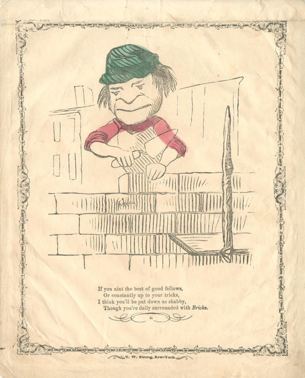 Text: If you aint the best of good fellows, / Or constantly up to your tricks, / I think you'll be put down as shabby, / Though you're daily surrounded with Bricks.