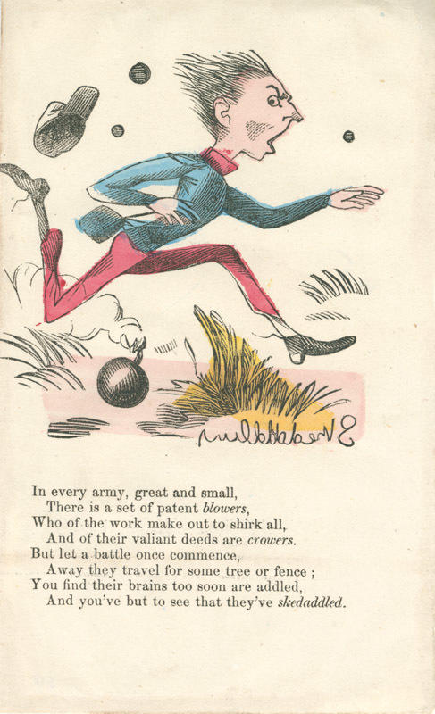 Text: In every army, great and small, / There is a set of patent blowers, / Who of the work make out to shirk all, / And of their valiant deeds are crowers. / But let a battle once commence, / Away they travel for some tree or fence; / You find their brains too soon are addled, / And you've but to see that they've skedaddled.
