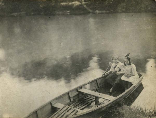 Group portrait depicting two girls, one in a sailor dress and holding a paddle, the other with a bow in her hair, sitting in a rowboat near the shore.