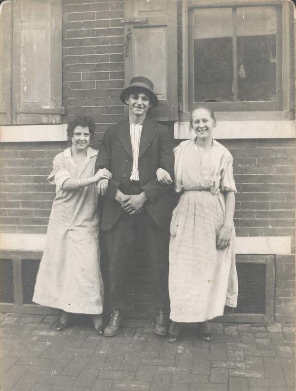 Group portrait showing a young man wearing a suit and hat standing in between two girls in front of a brick wall and windows in Philadelphia. The girls wear ankle-length checked aprons. All three subjects are smiling.