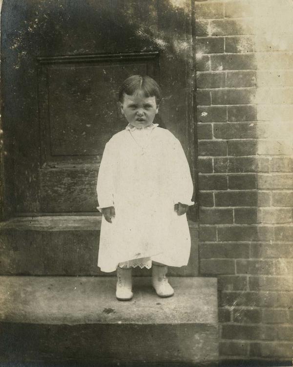 Portrait of a small child wearing a white long-sleeved dress, white shoes, and a petticoat adorned with eyelets standing on a doorstep in Philadelphia.