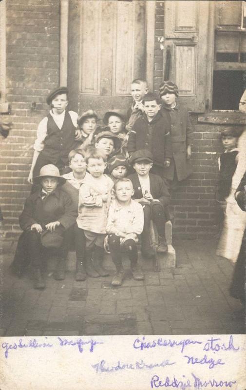 Group portrait of fourteen boys sitting and standing on steps in front of a brick house in Philadelphia. Several of them wear peaked caps or knitted hats and a few wear wool coats. A boy in the back row smokes a pipe. A boy in the front wears stockings torn with holes.