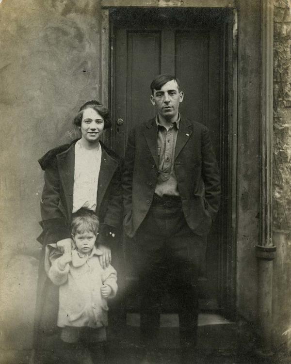Group portrait showing a young woman, with her hands on the shoulders of a little boy in front of her, standing beside a man in front of a door in Philadelphia. The woman wears a long coat with a velvet collar and cuffs, and the man wears a suit jacket.