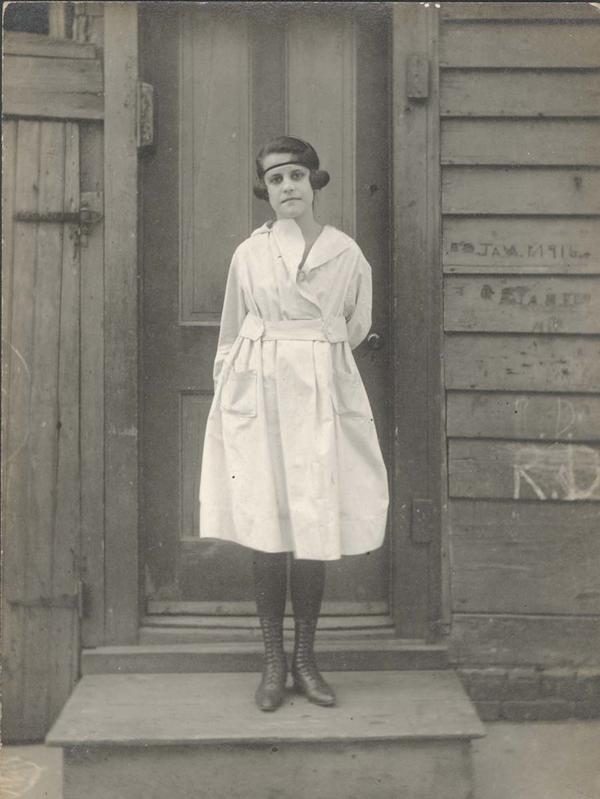 Portrait showing a young woman standing on a wooden step in front of a door in Philadelphia. She is neatly dressed in a bouffant dress (possibly a coat to wear motoring), dark stockings, and dark pointed shoes laced up to her calves. Her styled hair is secured with a headband around her forehead. Graffiti on a wooden wall behind her shows the date "JAN. 1 1916."