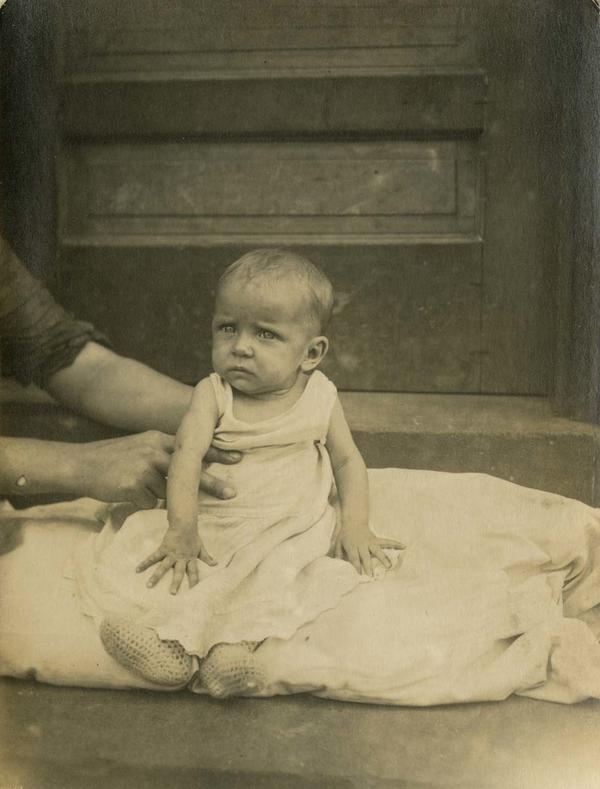 Portrait showing an infant, sitting on a pillow on a doorstep in Philadelphia, being helped to sit up by adult hands. The baby wears a sleeveless dress and and knitted booties.
