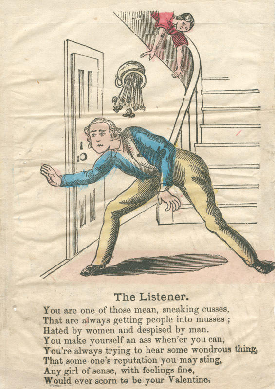 The listener holds his ear to a keyhole. A woman on a staircase above him throws a vase of flowers.