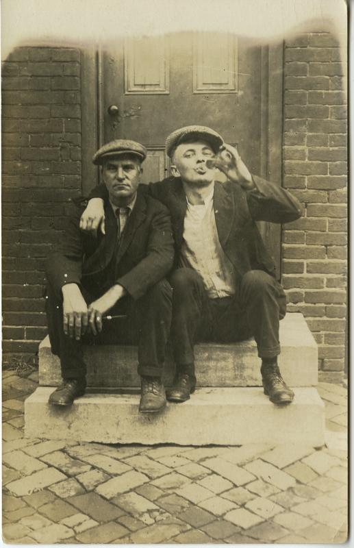 Group portrait showing two men in suits and their workman's caps sitting on a marble stoop in Philadelphia. The man on the right has his arm around the other's shoulders and drinks out of a beer bottle.