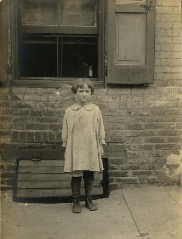 Portrait showing a little girl, about six years old, standing on a sidewalk in front of a window and cellar door in Philadelphia. She wears a soiled dress, dark stockings, and worn shoes.
